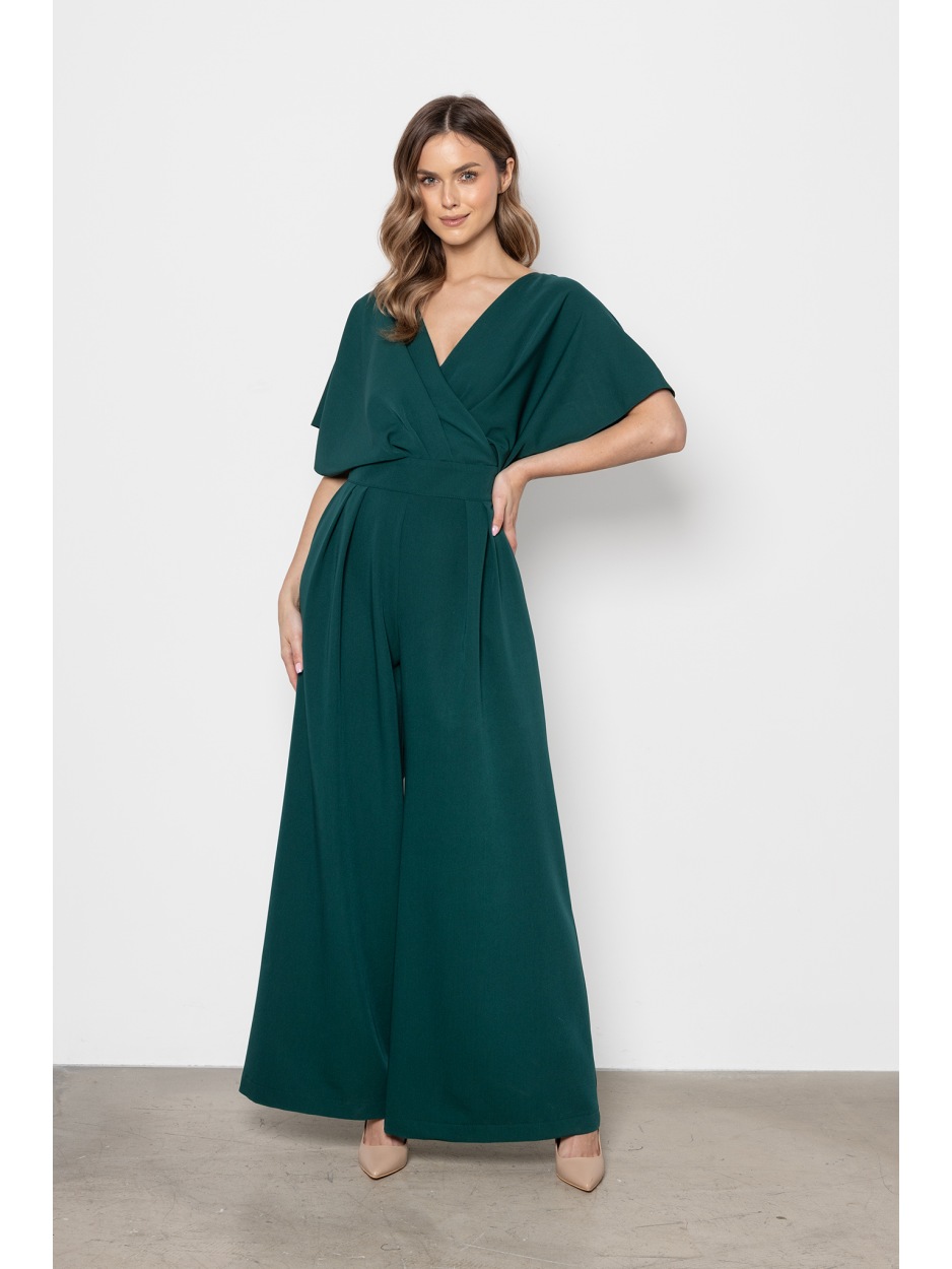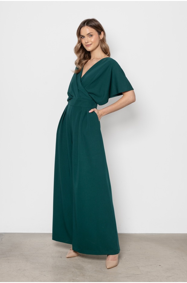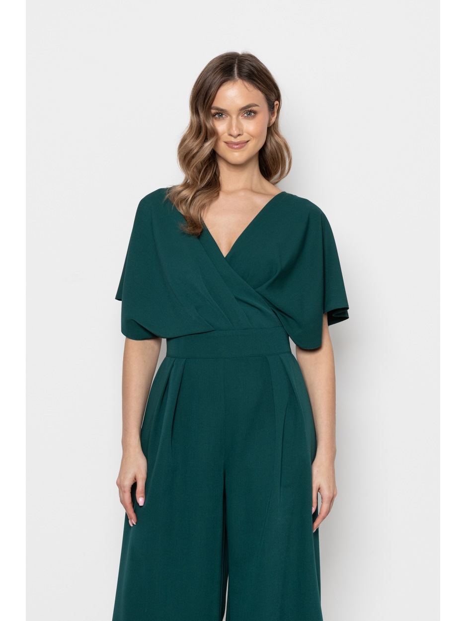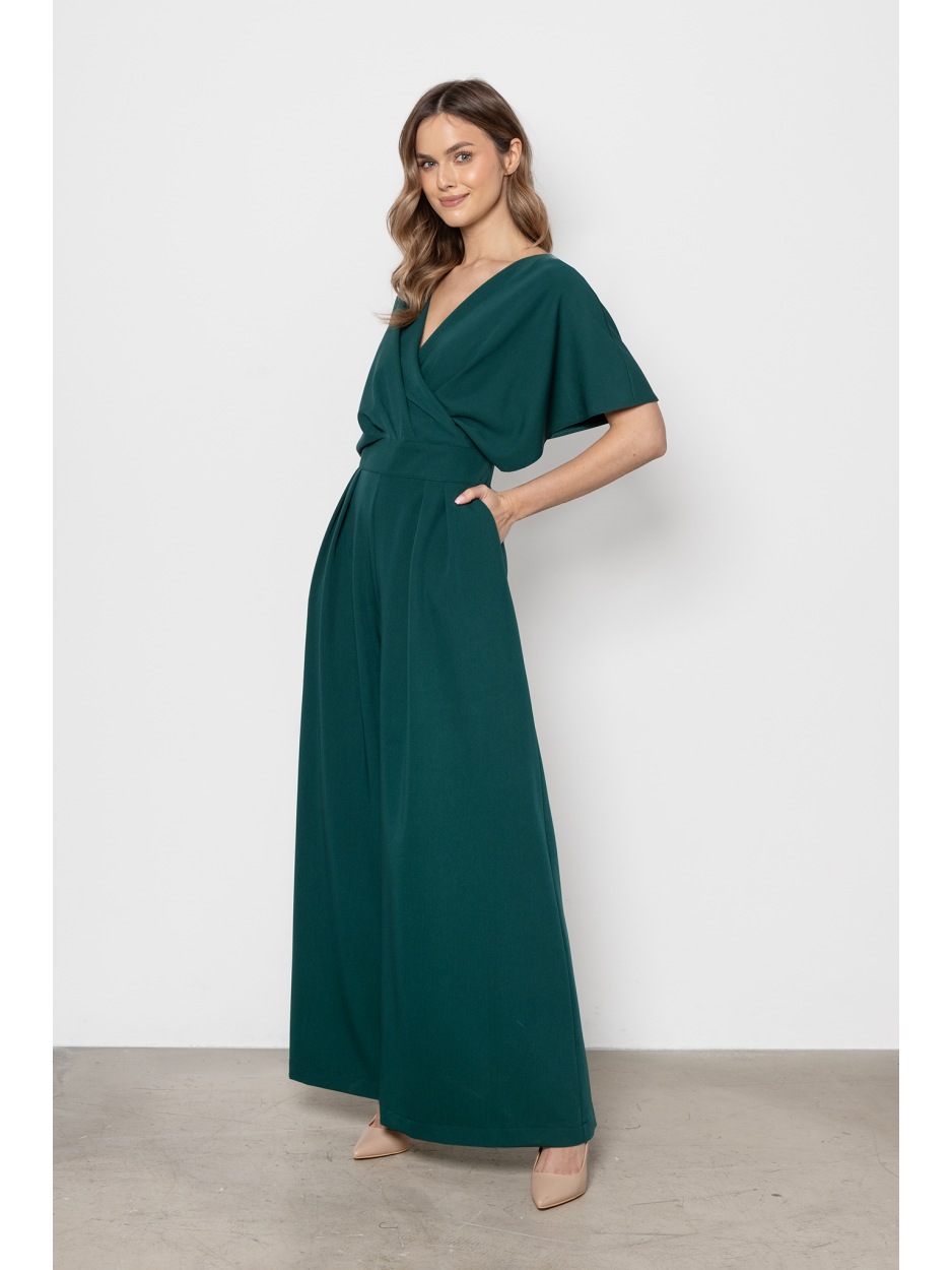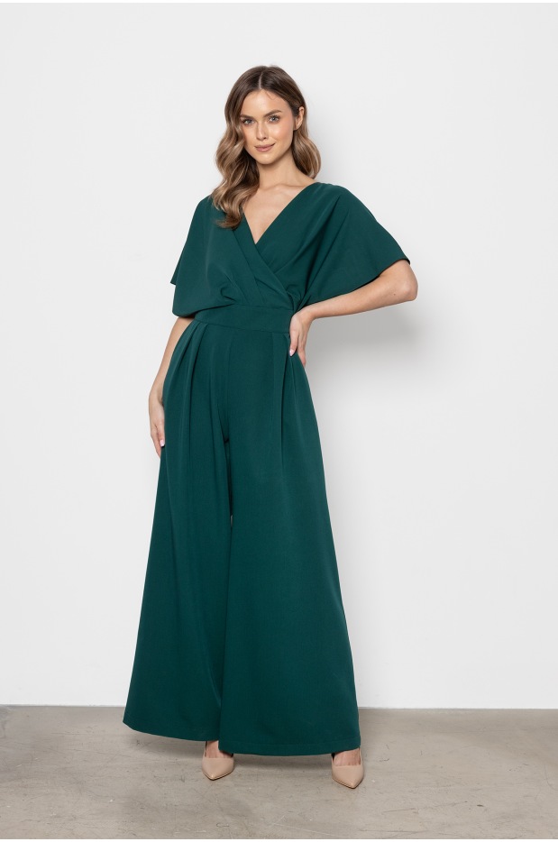 Elegancki kombinezon butelkowa zieleń z kopertowym dekoltem i szerokimi nogawkami - tył Elegancki kombinezon butelkowa zieleń z kopertowym dekoltem i szerokimi nogawkami - przód Elegancki kombinezon butelkowa zieleń z kopertowym dekoltem i szerokimi nogawkami - bok