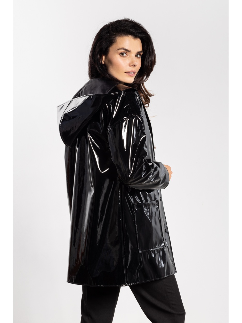 Lateksowa kurtka damska z kapturem i kieszeniami – modny fason