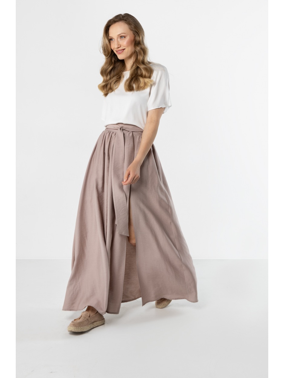 Kaszmirowa spódnica maxi z rozcięciem, wiązaniem w talii i gumką z tyłu