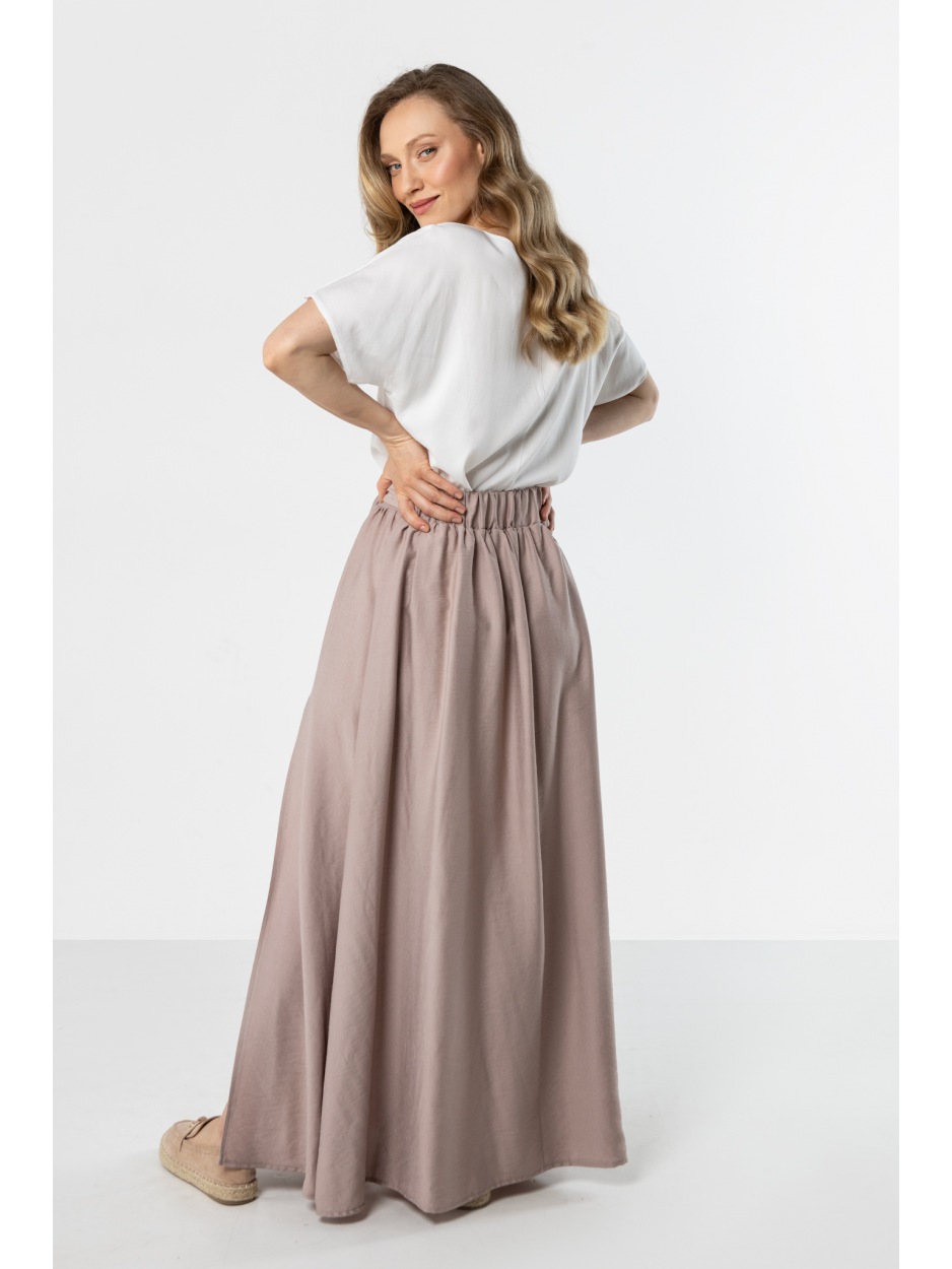 Ta kaszmirowa spódnica maxi to elegancka, a jednocześnie bardzo wygodna propozycja na co dzień i na lato. Długi, zwiewny fason pięknie układa się na sylwetce i nadaje stylizacjom lekkości. Z przodu znajduje się efektowne rozcięcie, które podkreśla nogę i zapewnia swobodę ruchu podczas chodzenia. Wiązanie w talii pozwala dopasować spódnicę do figury i podkreślić proporcje, a jednocześnie stanowi stylowy detal. Z tyłu pas został wykończony gumką, dzięki czemu spódnica lepiej leży i komfortowo dopasowuje się do talii. Kaszmirowy kolor jest neutralny i łatwy do łączenia – świetnie wygląda z bielą, czernią, beżami i pastelami.