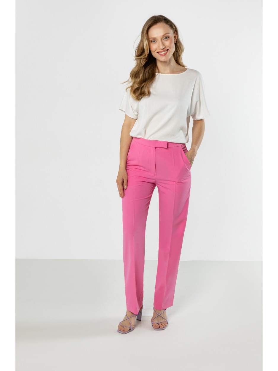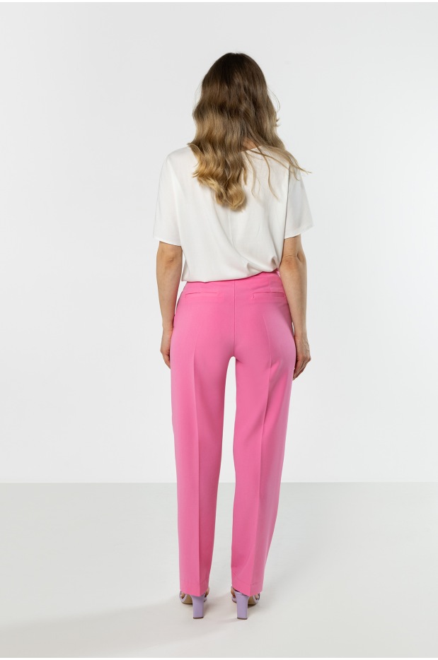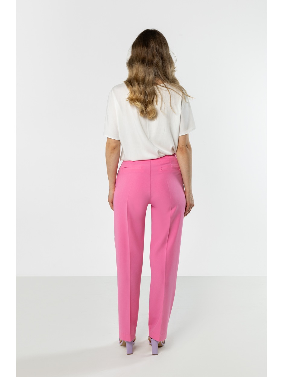 Różowe eleganckie spodnie damskie z prostą nogawką – kolor, który robi stylizację - tył Różowe eleganckie spodnie damskie z prostą nogawką – kolor, który robi stylizację - przód Różowe eleganckie spodnie damskie z prostą nogawką – kolor, który robi stylizację - bok