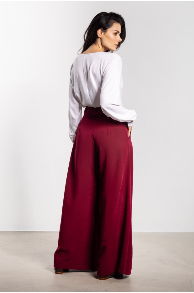 Spodnie w kolorze burgundowym to wyjątkowa propozycja dla kobiet ceniących elegancję i wygodę. Uszyte w Polsce z tkaniny z dodatkiem wiskozy, zapewniają komfort noszenia i doskonałą jakość. Wysoki stan pięknie podkreśla talię, a szerokie nogawki nadają sylwetce lekkości i nowoczesnego charakteru. To model idealny na sezon jesień–zima.