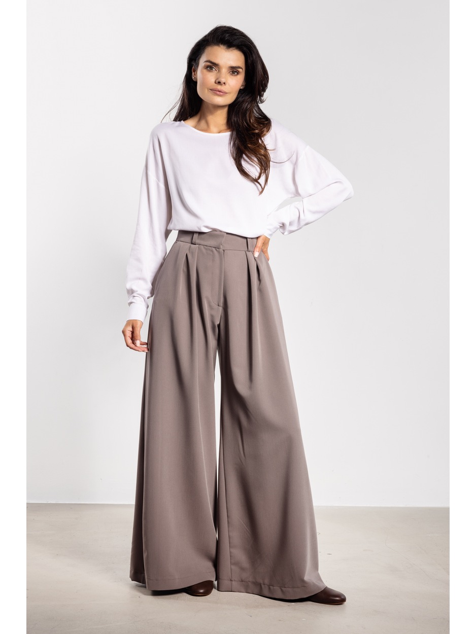 Spodnie damskie w kolorze taupe to propozycja dla kobiet, które cenią wygodę i elegancję w nowoczesnym wydaniu. Uszyte w Polsce z wysokiej jakości tkaniny z dodatkiem wiskozy, prezentują się stylowo i są niezwykle komfortowe w noszeniu. Wysoki stan oraz szeroka, lekko opływająca nogawka pięknie wydłużają sylwetkę, a praktyczne kieszenie dodają im funkcjonalności.