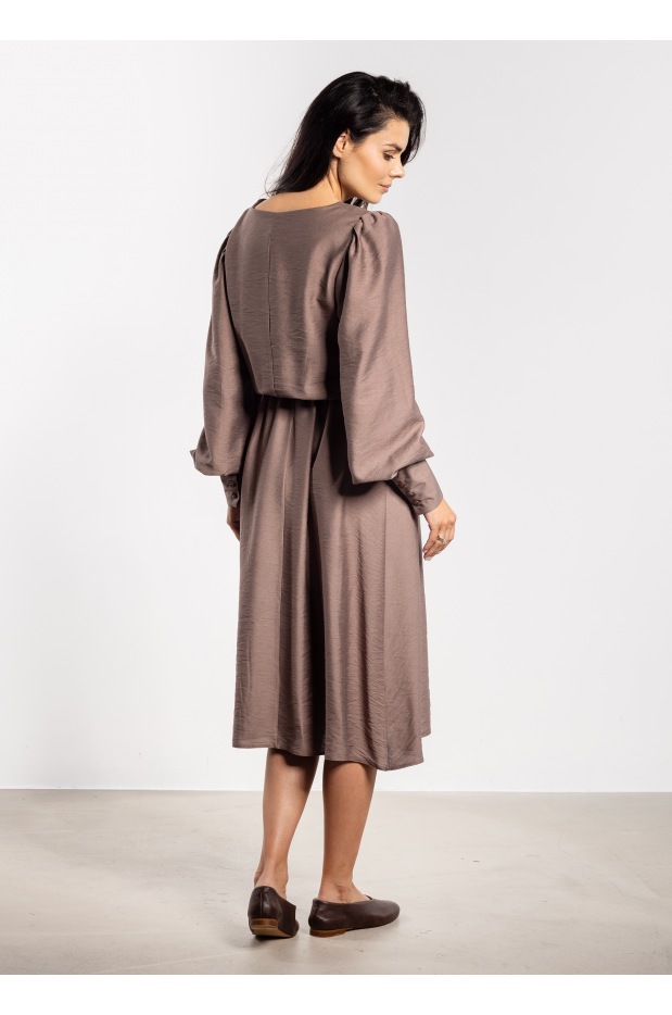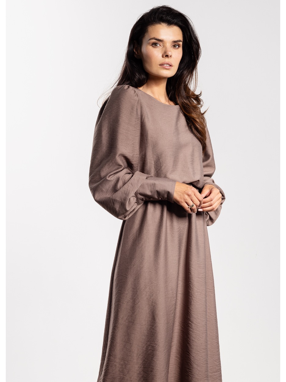 Sukienka midi w kolorze taupe to propozycja dla kobiet, które cenią klasykę w nowoczesnym wydaniu. Uszyta z naturalnego materiału rayon, jest niezwykle przyjemna dla ciała i komfortowa w noszeniu. Długość midi, elegancki krój z gumką w talii oraz długie rękawy sprawiają, że sukienka świetnie sprawdza się w sezonie jesień–zima.