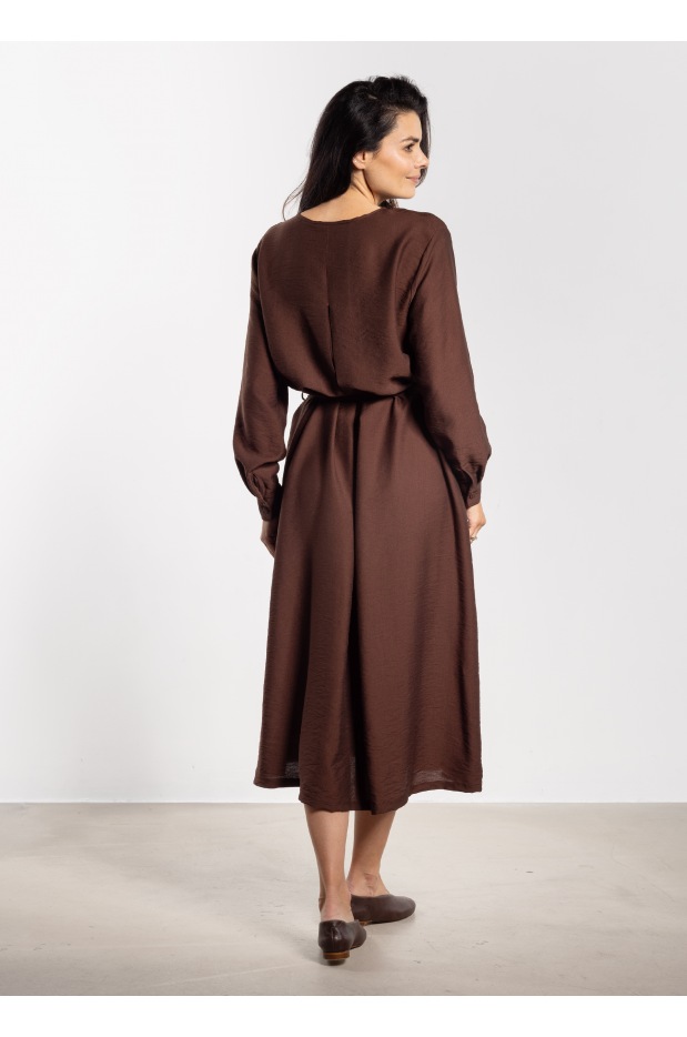 Postaw na kobiecy styl i komfort – zamów już teraz sukienkę midi w kolorze czekoladowym i uzupełnij swoją garderobę o klasyczny model na każdą okazję!