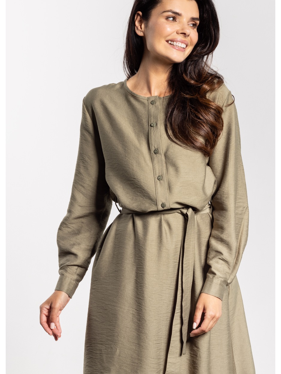 Sukienka midi w kolorze szałwiowym z rayonu to połączenie elegancji, komfortu i funkcjonalności. Dzięki uniwersalnemu krojowi, klasycznym detalom i możliwości stylizacji z paskiem lub bez niego, stanie się niezastąpionym elementem Twojej garderoby na sezon jesień–zima.