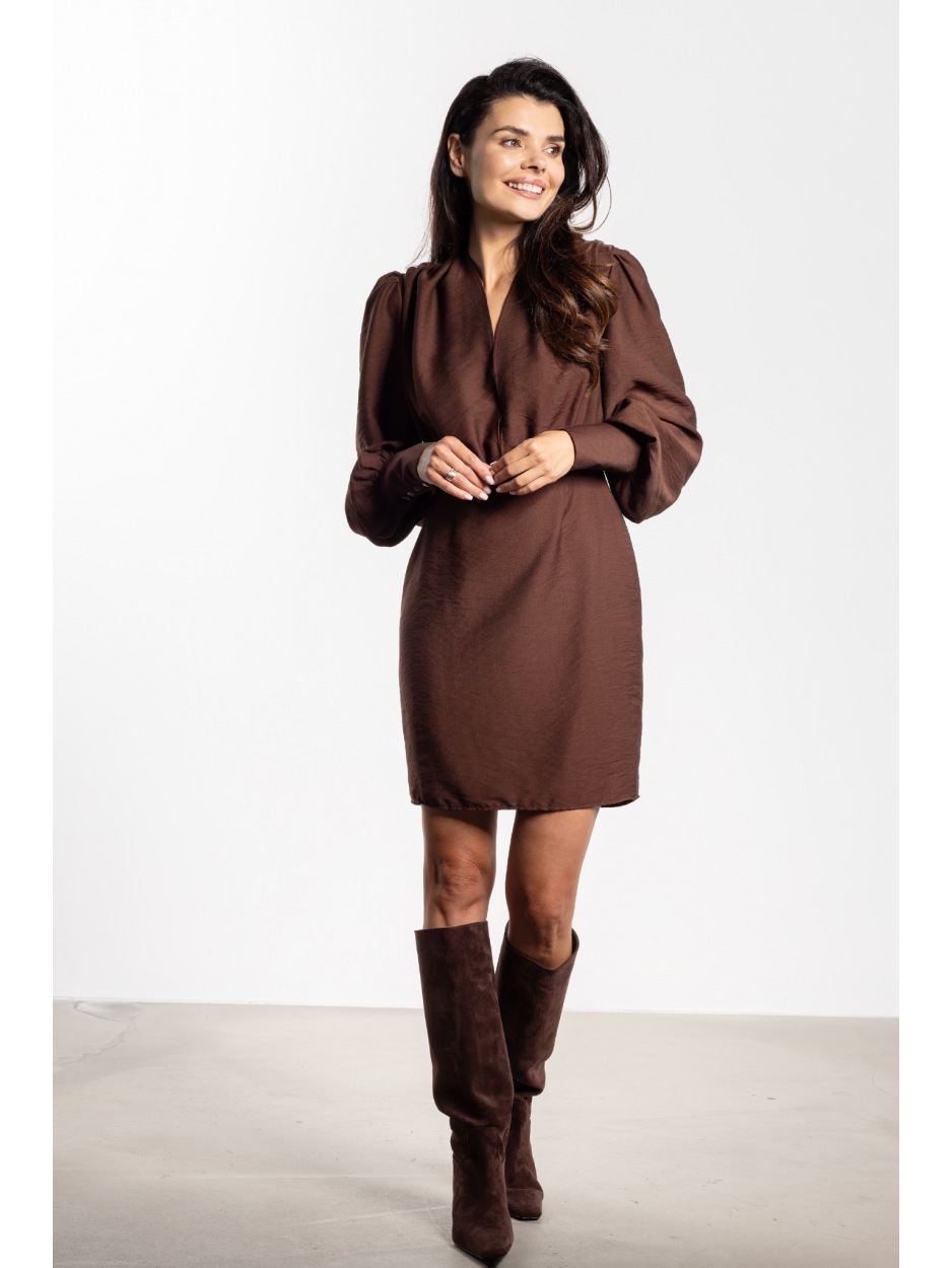 Sukienka mini w kolorze czekoladowym to kwintesencja elegancji i nowoczesnego stylu. Uszyta z naturalnego materiału rayon, jest miękka, przewiewna i niezwykle komfortowa w noszeniu. Krótki fason pięknie eksponuje nogi, a dopasowana talia subtelnie podkreśla sylwetkę. Długie bufiaste rękawy nadają lekkości, a głęboki dekolt w serek dodaje kobiecego charakteru, czyniąc ten model doskonałym wyborem na sezon jesień–zima.