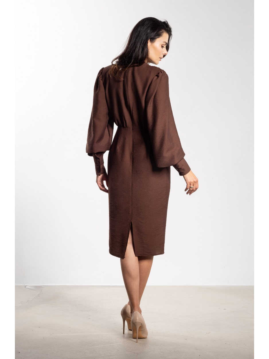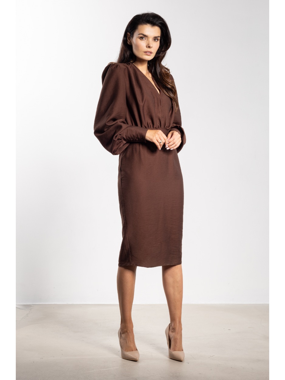 Sukienka midi w kolorze czekoladowym z rayonu to połączenie ponadczasowej elegancji, wygody i kobiecego stylu. Dopasowany krój, dekolt w serek i bufiaste rękawy sprawiają, że stanie się niezastąpionym elementem Twojej jesienno-zimowej garderoby.