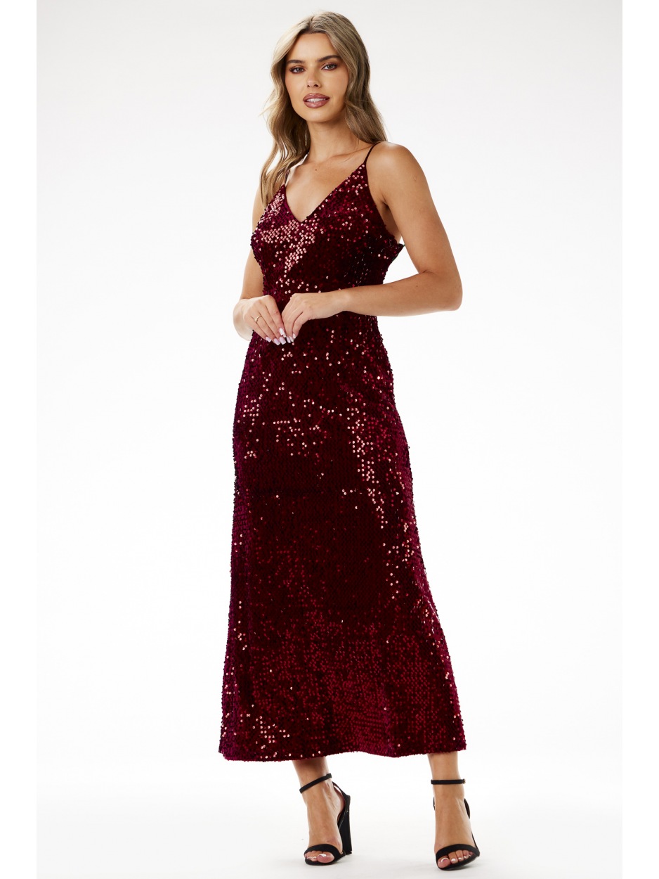 Elegancka sukienka wieczorowa maxi, uszyta z weluru z cekinami w kolorze bordowym. Ta wyjątkowa sukienka podkreśla atuty kobiecej sylwetki, sprawiając, że staniesz się gwiazdą każdej imprezy.