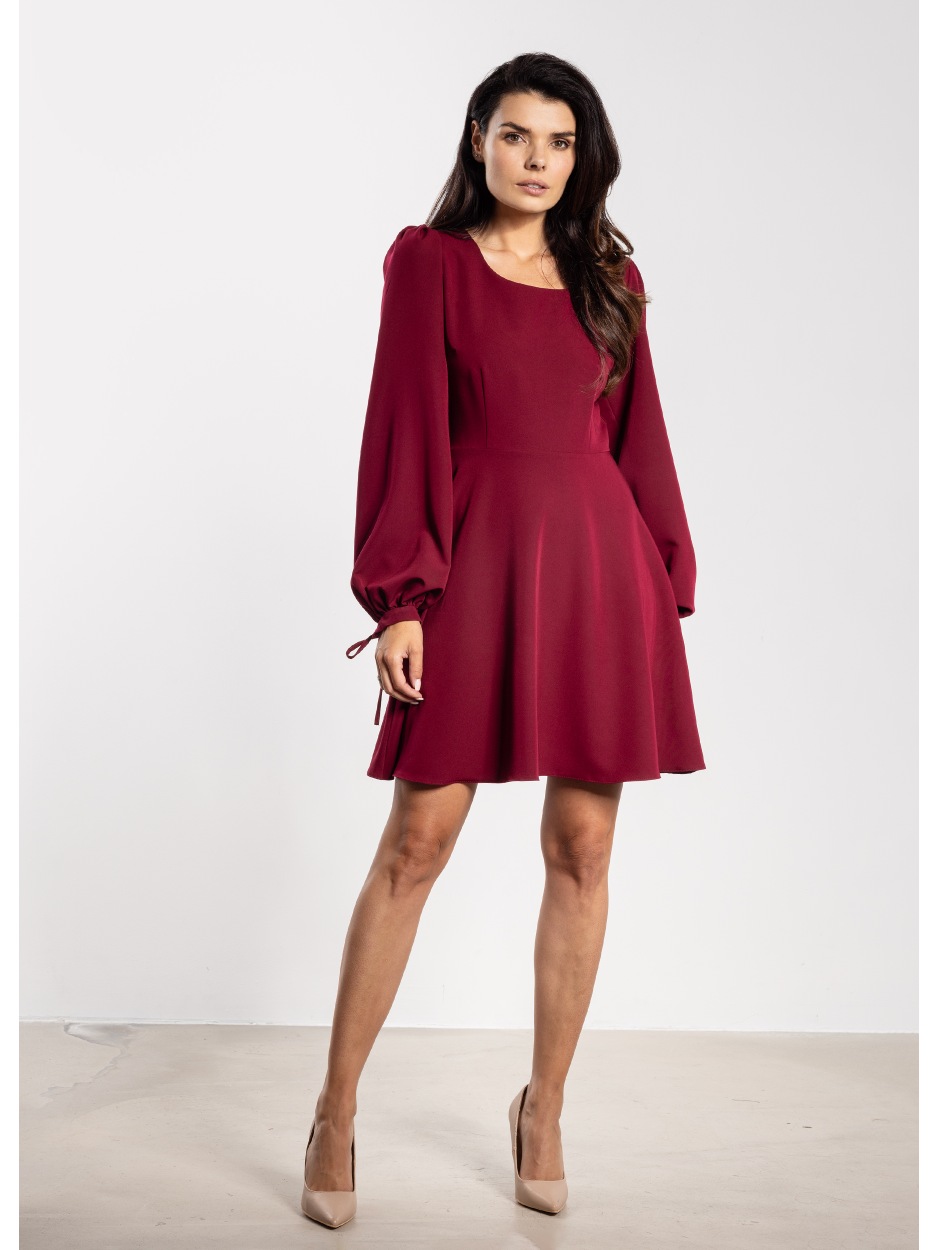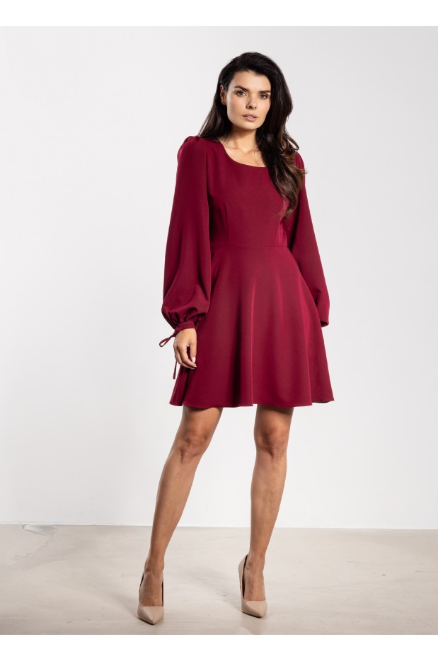 Sukienka mini w kolorze burgundowym to kwintesencja elegancji i kobiecości. Uszyta z tkaniny z dodatkiem wiskozy, jest miękka, komfortowa i delikatnie dopasowuje się do sylwetki. Klasyczny fason podkreślony rozkloszowanym dołem oraz długimi rękawami z ozdobnym wiązaniem sprawia, że sukienka wyróżnia się subtelną lekkością i ponadczasowym urokiem. Piękny, głęboki odcień burgundu dodaje jej szyku i elegancji, czyniąc z niej idealną propozycję na jesień i zimę.