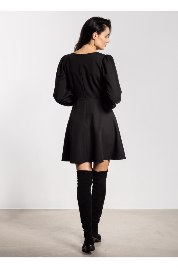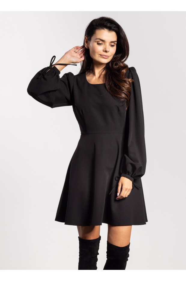 Czarna sukienka mini to ponadczasowa propozycja, która doskonale łączy elegancję z wygodą. Uszyta z tkaniny z dodatkiem wiskozy, jest miękka, przewiewna i przyjemna dla skóry. Klasyczna długość mini subtelnie podkreśla nogi, a lekko rozkloszowany dół dodaje sylwetce lekkości. Długie rękawy zakończone ozdobnym wiązaniem tworzą modny akcent, który nadaje całości wyjątkowego charakteru. Zapinana z tyłu na kryty zamek, gwarantuje idealne dopasowanie.